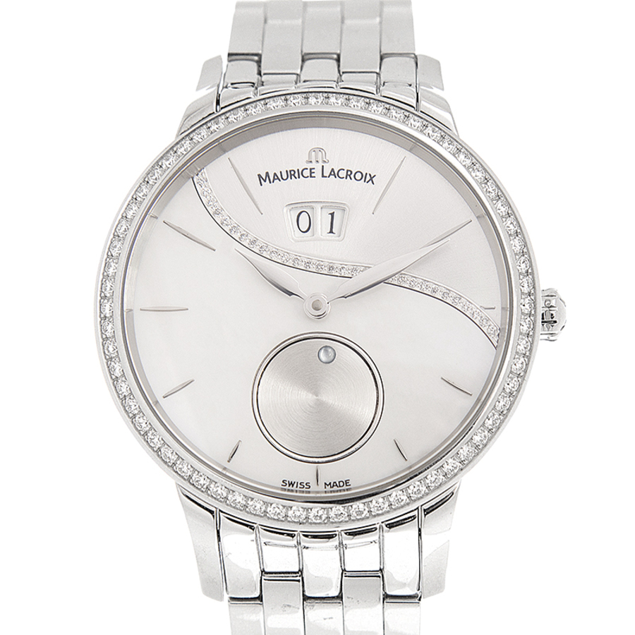 Silver-tone stainless steel case with a silver-tone stainless steel bracelet. Fixed silver-tone bezel with diamond set. Silver-tone dial with silver-tone alpha-style shape hands and index hour markers. Dial Type: Analog. Date display at the 12 o'clock position. One subdial displaying: small second. Automatic movement with a 38-hour power reserve. Scratch resistant sapphire crystal. Pull / push crown. Transparent case back. Round case shape, case size: 38 mm. Butterfly clasp. Water resistant at 50 meters / 165 feet. Functions: big date, hour, minute, small second. Starside Magic Second Series. Luxury watch style. Watch label: Swiss Made. Maurice Lacroix Starside Magic Second Automatic Diamond Silver Dial Watch SD6207-SD502-170.