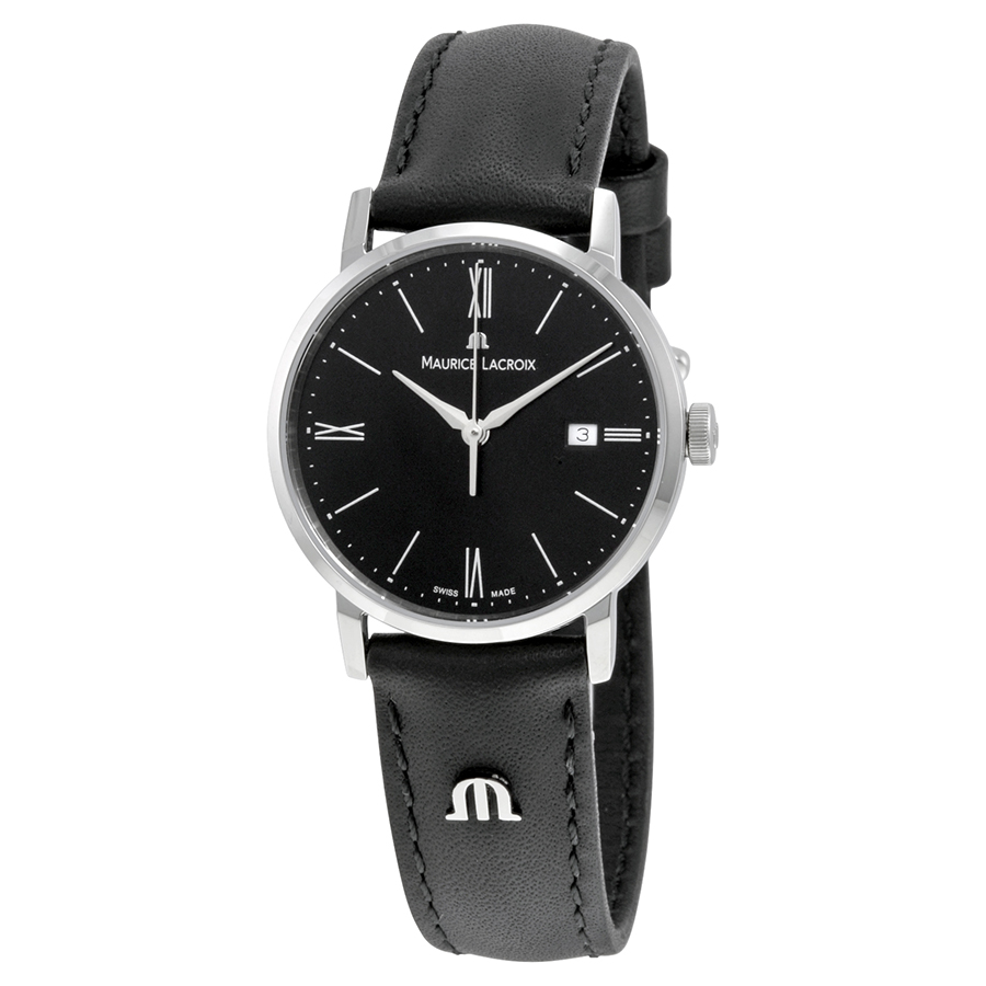 Stainless steel case with a black leather strap. Fixed bezel. Black dial with silver-tone hands and index- Roman numeral hour markers. Dial Type: Analog. Date display at the 3 o'clock position. Quartz movement. Scratch resistant sapphire crystal. Pull / push crown. Solid case back. Case diameter: 30 mm. Case thickness: 8 mm. Round case shape. Band width: 16 mm. Buckle clasp. Water resistant at 50 meters / 165 feet. Functions: date, hour, minute, second. Dress watch style. Watch label: Swiss Made. Item Variations: EL1084 SS001 310, EL1084.SS001.310, EL1084SS001310. Maurice Lacroix Eliros Date Black Dial Black Leather Strap Ladies Quartz Watch El1084-ss001-310.