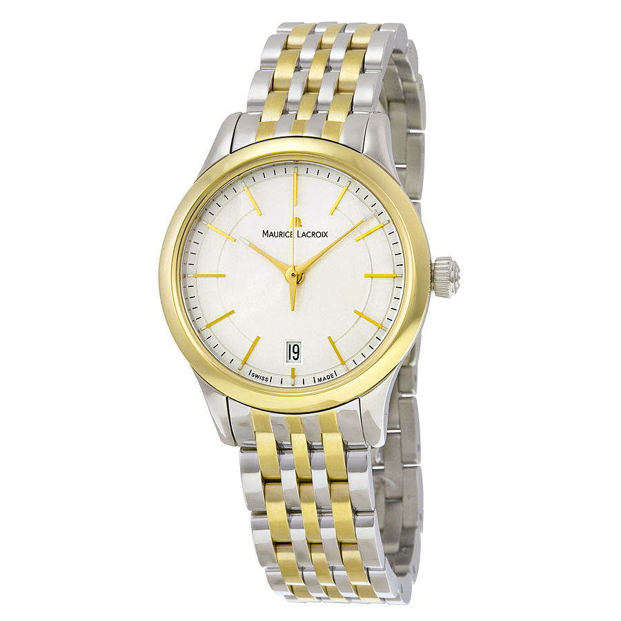 Gold stainless steel case with a two-tone (silver and gold-tone) stainless steel bracelet. Fixed gold-tone bezel. Silver dial with gold-tone hands and index hour markers. Minute markers around the outer rim. Dial Type: Analog. Luminescent hands and markers. Date display at the 6 o'clock position. Quartz movement. Scratch resistant sapphire crystal. Pull / push crown. Solid case back. Case diameter: 33 mm. Case thickness: 8 mm. Round case shape. Band width: 15 mm. Fold over clasp. Water resistant at 30 meters / 100 feet. Functions: date, hour, minute, second. Dress watch style. Watch label: Swiss Made. Item Variations: LC1026 PVY13 130, LC1026.PVY13.130, LC1026PVY13130. Maurice Lacroix Les Classiques Date Silver Dial Two-tone Ladies Quartz Watch LC1026-PVY13-130.