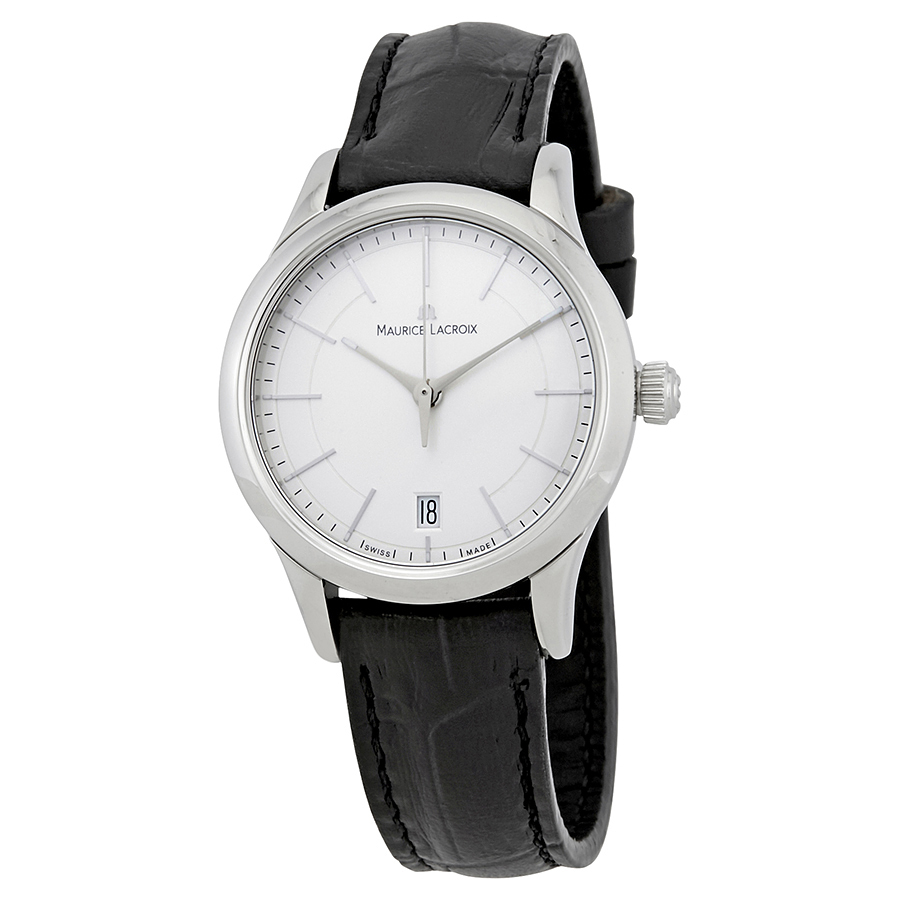 Silver-tone stainless steel case with a black leather strap. Fixed silver-tone bezel. Silver dial with silver-tone hands and index hour markers. Minute markers around the outer rim. Dial Type: Analog. Date display at the 6 o'clock position. Quartz movement. Scratch resistant sapphire crystal. Pull / push crown. Solid case back. Case size: 33 mm. Case thickness: 8 mm. Round case shape. Band width: 16 mm. Tang clasp. Water resistant at 30 meters / 100 feet. Functions: date, hour, minute, second. Casual watch style. Watch label: Swiss Made. Item Variations: LC1026SS001130. Maurice Lacroix Les Classiques Silver Dial Ladies Watch LC1026-SS001-130.