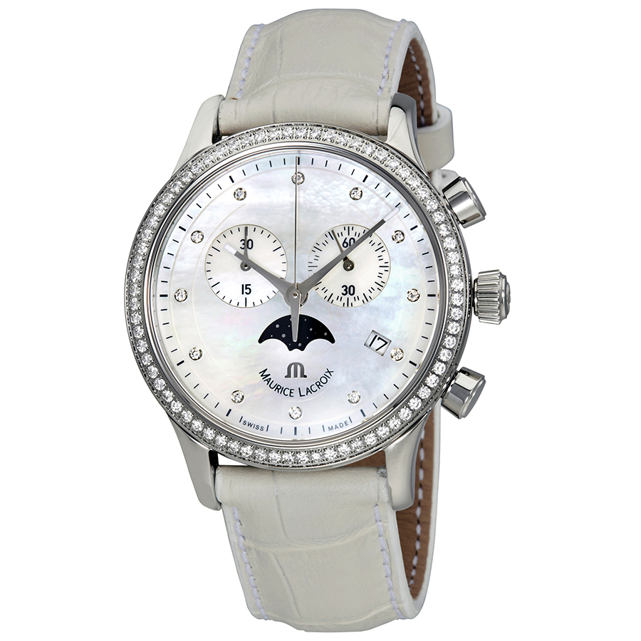 . Silver-tone stainless steel case with a white leather strap. Fixed silver-tone stainless steel cut with diamonds bezel. Mother of pearl dial with silver-tone hands and diamond hour markers. Minute markers around the outer rim. Dial Type: Analog. Date display at the 4 o'clock position. Chronograph - three sub-dials displaying: 60 seconds 30 minutes and moonphase. Quartz movement. Scratch resistant sapphire crystal. Pull / push crown. Solid case back. Case size: 38 mm. Case thickness: 9 mm. Round case shape. Band width: 20 mm. Tang clasp. Water resistant at 30 meters / 100 feet. Functions: chronograph, date, hour, minute, second. Additional Info: n general, withstands splashes or brief immersion in water, but not suitable for swimming. Dress watch style. Watch label: Swiss Made. Item Variations: LC1087 SD501 160, LC1087.SD501.160, LC1087SD501160. Maurice Lacroix Les Classiques Phase de Lune Chrono Ladies Watch LC1087-SD501-160.