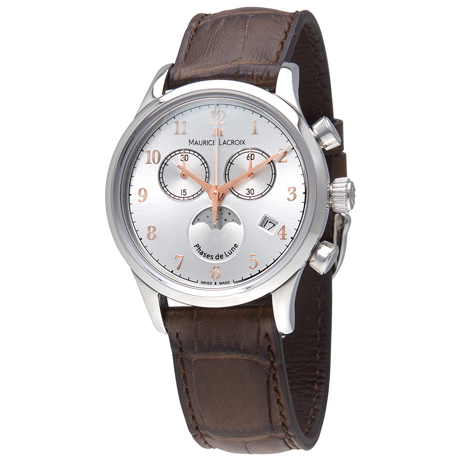 Stainless steel case with a brown leather strap. Fixed bezel. Silver dial with rose gold-tone hands and Arabic numeral hour markers. Dial Type: Analog. Date display at the 4 o'clock position. Chronograph - three sub-dials displaying: 60 second, 30 minute and moonphase. Quartz movement. Scratch resistant sapphire crystal. Pull / push crown. Solid case back. Case size: 38 mm. Round case shape. Buckle clasp. Water resistant at 30 meters / 100 feet. Functions: date, hour, minute, second. Luxury watch style. Watch label: Swiss Made. Maurice Lacroix Les Classiques Unisex Watch LC1087-SS001-121.
