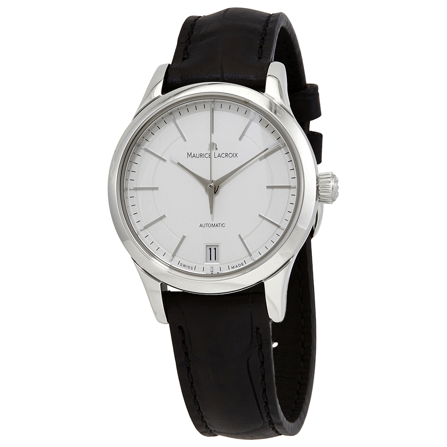 Silver-tone stainless steel case with a black leather strap. Fixed silver-tone stainless steel bezel. Silver dial with silver-tone hands and index hour markers. Minute markers around the outer rim. Dial Type: Analog. Date display at the 6 o'clock position. Automatic movement. Scratch resistant sapphire crystal. Pull / push crown. Transparent case back. Round case shape. Case size: 38 mm. Buckle clasp. Water resistant at 30 meters / 100 feet. Functions: date, hour, minute, second. Casual watch style. Watch label: Swiss Made. Maurice Lacroix Les Classiques Automatic Silver Dial Unisex Watch LC6016-SS001-130.