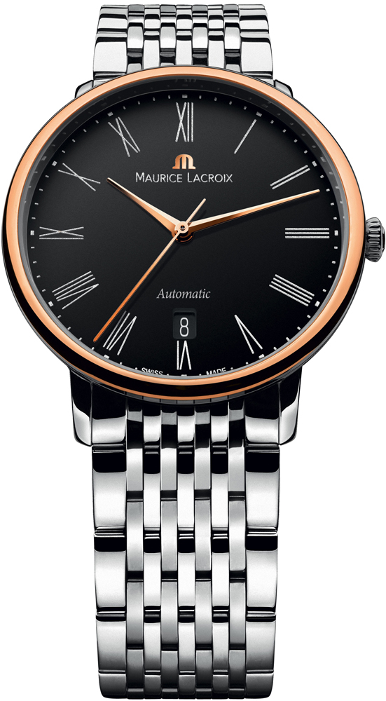 18 carat rose gold case with a stainless steel bracelet. Fixed bezel. Black dial with rose gold-tone hands and Roman numeral hour markers. Minute markers around the outer rim. Dial Type: Analog. Date display at the 6 o'clock position. Automatic movement. Scratch resistant sapphire crystal. Pull / push crown. Skeleton transparent exhibition see through case back. Case diameter: 38mm. Round case shape. Fold over with safety clasp. Water resistant at 30 meters / 100 feet. Functions: date, hour, minute, second. Luxury watch style. Watch label: Swiss Made. Maurice Lacroix Les Classiques Tradition Black Dial Mens Automatic Stainless Steel Watch LC6067-PS102-310.