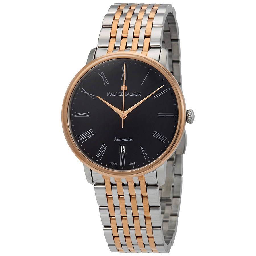 18kt rose gold and stainless steel case with a stainless steel with 18kt rose gold links bracelet. Fixed 18kt rose gold bezel. Black dial with rose gold-tone hands and Roman numeral hour markers. Minute markers around the outer rim. Dial Type: Analog. Date display at the 6 o'clock position. Maurice Lacroix Calibre ML 155 automatic movement with a 38-hour power reserve. Scratch resistant sapphire crystal. Pull / push crown. Transparent case back. Round case shape. Case size: 38 mm. Band width: 18 mm. Fold over with safety release clasp. Water resistant at 30 meters / 100 feet. Functions: date, hour, minute, second. Luxury watch style. Watch label: Swiss Made. Item Variations: LC6067 PS103 310, LC6067.PS103.310, LC6067PS103310. Maurice Lacroix Les Classiques Automatic Black Dial Mens Watch LC6067-PS103-310.