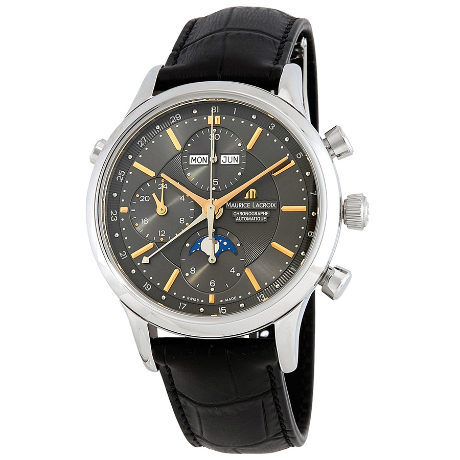 Silver-tone stainless steel case with a black crocodile leather strap. Fixed silver-tone stainless steel bezel. Grey dial with gold-tone hands and index hour markers. Minute markers around the outer rim. Dial Type: Analog. Day of the week and date display at 12 o'clock. Three sub-dials displaying: 12 hour/moonphase, 24 hour/60 second and 30 minute. Maurice Lacroix Calibre ML 154 Automatic movement, containing 25 Jewels, bitting at 28800 vph, and has a power reserve of approximately 48 hours. Scratch resistant sapphire crystal. Pull / push crown. Skeleton transparent exhibition see through case back. Round case shape, case size: 41 mm. Deployment with push button release clasp. Water resistant at 30 meters / 100 feet. Functions: moon phase, chronograph, GMT, second time zone, month, date, day, hour, minute, second. Les Classiques Series. Luxury watch style. Watch label: Swiss Made. Item Variations: LC6078 SS001 331, LC6078.SS001.331, LC6078SS001331. Maurice Lacroix Les Classiques Phase de Lune Chronograph Grey Dial Black Leather Mens Automatic Watch LC6078-SS001-331.