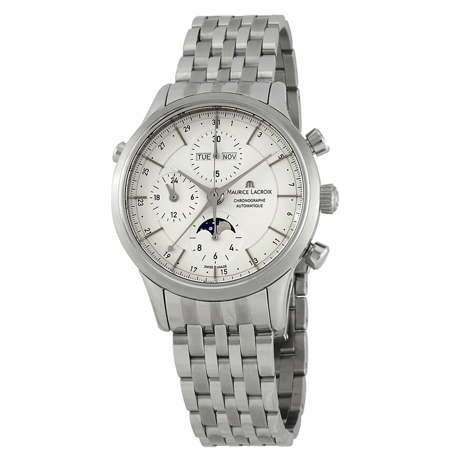 Silver-tone stainless steel case with a silver-tone stainless steel bracelet. Fixed silver-tone stainless steel bezel. Silver dial with silver-tone hands and stick hour markers. Minute markers around the outer rim. Dial Type: Analog. Luminescent hands and markers. Day of the week and month display at the 12 o'clock position, date display around outer rim. Three sub-dials displaying: 12 hour/moonphase, 24 hour/60 second and 30 minute. Maurice Lacroix Calibre ML 154 Automatic movement, containing 25 Jewels, bitting at 28800 vph, and has a power reserve of approximately 48 hours. Scratch resistant sapphire crystal. Pull / push crown. Solid case back. Round case shape, case size: 41 mm, case thickness: 14.25 mm. Band width: 20 mm, band length: 8 inches. Deployment with push button release clasp. Water resistant at 30 meters / 100 feet. Functions: moon phase, chronograph, GMT, second time zone, month, date, day, hour, minute, second. Les Classiques Phase De Lune Series. Luxury watch style. Watch label: Swiss Made. Item Variations: LC6078 SS002 13E, LC6078.SS002.13E, LC6078SS00213E. Maurice Lacroix Les Classiques Phase de Lune Chronograph GMT Automatic Mens Watch LC6078-SS002-13E.