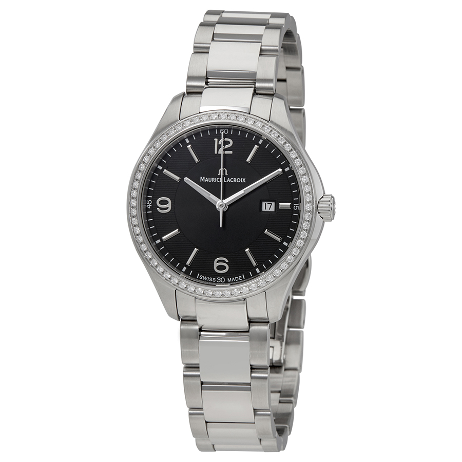 Stainless steel case with a stainless steel bracelet. Fixed diamond bezel. Black dial with luminous hands and index and Arabic hour markers. Minute markers around the outer rim. Dial Type: Analog. Date display at the 3 o'clock position. Quartz movement. Scratch resistant sapphire crystal. Pull / push crown. Solid case back. Case diameter: 32 mm. Case thickness: 8 mm. Round case shape. Band width: 15 mm. Band length: 7 inches. Deployment clasp. Water resistant at 100 meters / 330 feet. Functions: date, hour, minute, second. Additional Info: bezel set with 60 diamonds aprox. 0.408 carats. Dress watch style. Watch label: Swiss Made. Item Variations: MI1014 SD502 330, MI1014.SD502.330, MI1014SD502330. Maurice Lacroix Miros Black Dial Steel Diamond Ladies Watch MI1014-SD502-330.
