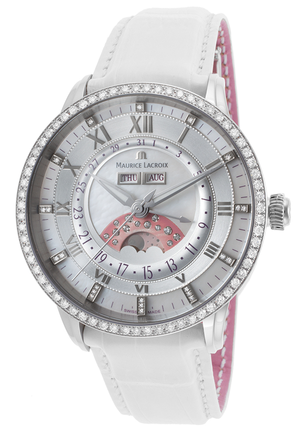 Silver-tone stainless steel case with a white leather strap. Fixed silver-tone diamond set bezel. Mother of pearl dial with silver-toned hands and Roman numeral and diamond hour markers. Minute markers around the outer rim. Dial Type: Analog. Luminescent hands. Perpetual calendar. One - moon phase subdial. Maurice Lacroix Calibre ML 163 automatic movement. Scratch resistant sapphire crystal. Pull / push crown. Transparent case back. Round case shape. Case size: 41 mm. Deployment with push button release clasp. Water resistant at 30 meters / 100 feet. Functions: moon phase, month, date, day, hour, minute, second. Luxury watch style. Watch label: Swiss Made. Item Variations: MP6428 SD501 17E, MP6428.SD501.17E, MP6428SD50117E. Maurice Lacroix Masterpiece Phase De Lune Automatic Diamond Ladies Watch MP6428-SD501-17E.