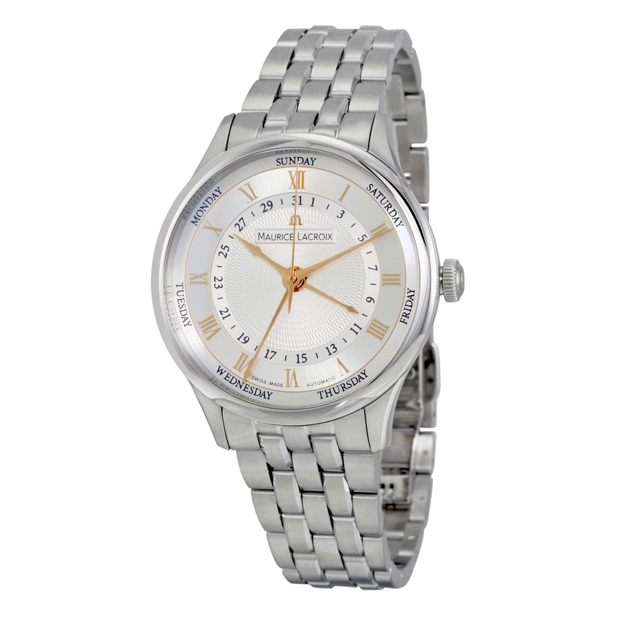 Stainless steel case with a stainless steel bracelet. Fixed stainless steel bezel. Silver dial with rose gold-tone hands and Roman numeral hour markers. Date scale around an inner ring. Days of the week diaplayed around the outer rim. Dial Type: Analog. Maurice Lacroix calibre ML 159 automatic movement with a 38-hour power reserve. Scratch resistant sapphire crystal. Pull / push crown. Transparent case back. Round case shape. Case size: 40 mm. Case thickness: 11 mm. Band width: 20 mm. Fold over clasp with a push button release. Water resistant at 50 meters / 165 feet. Functions: date, day, hour, minute, second. Luxury watch style. Watch label: Swiss Made. Item Variations: MP6507 SS002 111, MP6507.SS002.111, MP6507SS002111. Maurice Lacroix Masterpiece Cinq Aiguilles Mens Watch MP6507-SS002-111.