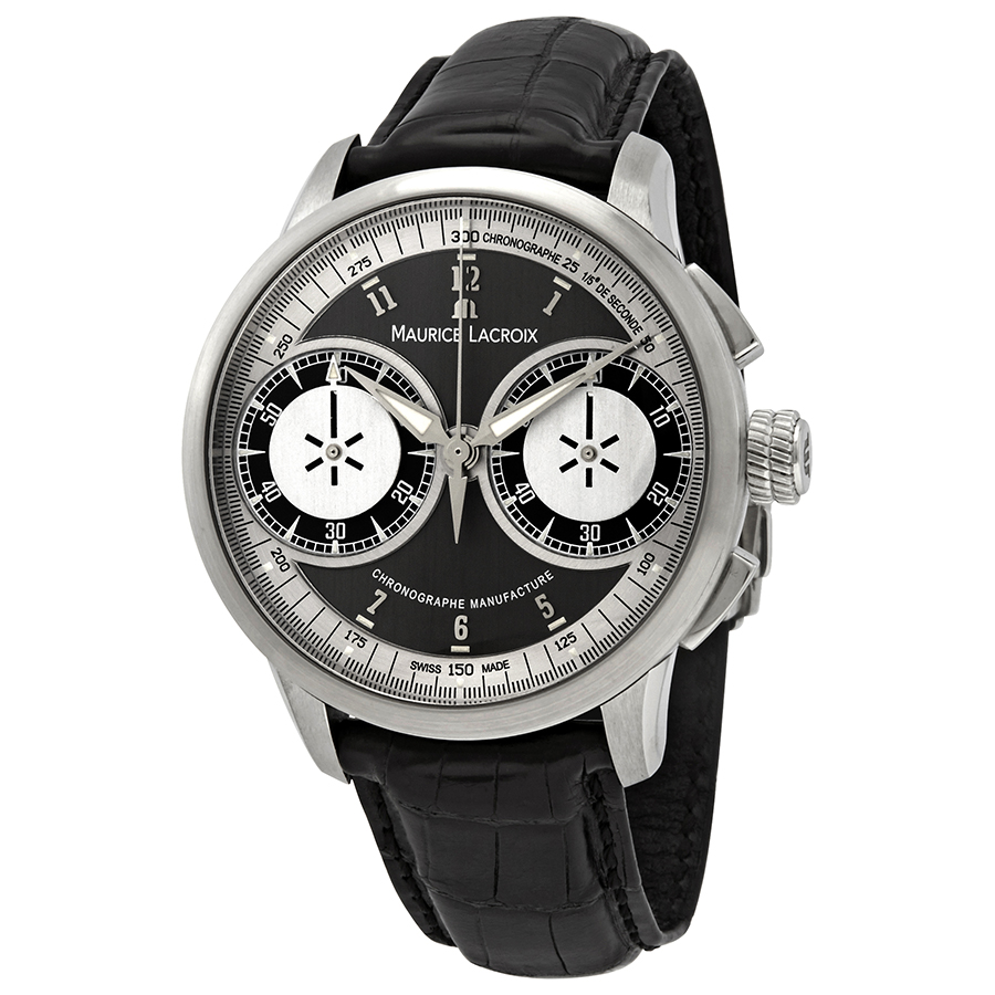Stainless steel case with a black leather strap. Fixed stainless steel bezel. Grey dial with luminous silver-tone alpha-style hands and Arabic numeral hour markers. Tachymeter markers around the outer rim. Dial Type: Analog. Luminescent hands. Chronograph - two sub-dials displaying: 60 second and 60 minute. Maurice Lacroix calibre ML 106-2 hand wind movement, containing 20 jewels, bitting at 18000 vph, and has a power reserve of approximately 42 hours. Scratch resistant sapphire crystal. Pull / push crown. Transparent case back. Round case shape. Case size: 45 mm. Case thickness: 14 mm. Band width: 21 mm. Band length: 8 inches. Fold over clasp. Water resistant at 30 meters / 100 feet. Functions: chronograph, tachymeter, hour, minute, second. Masterpiece Le Chronographe Series. Luxury watch style. Watch label: Swiss Made. Item Variations: MP7128 SS001 320, MP7128.SS001.320, MP7128SS001320. Maurice Lacroix Masterpiece Le Chronographe Grey Dial Black Leather Mens Watch MP7128-SS001-320.