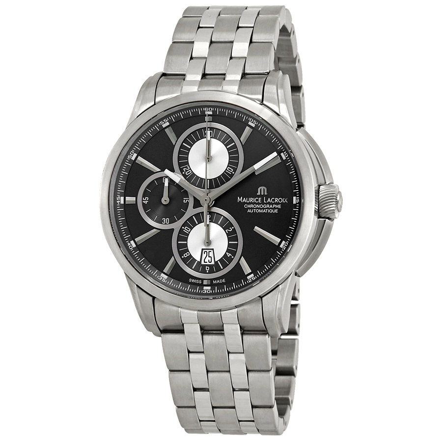 Stainless steel case with a stainless steel bracelet. Fixed stainless steel bezel. Gray dial with luminous tipped silver-tone hands and index hour markers. Minute markers around the outer rim. Dial Type: Analog. Luminescent hands and markers. Date display at the 6 o'clock position. Chronograph - three sub-dials displaying: 60 second, 30 minute and 12-hour. Maurice Lacroix calibre ML 112 automatic movement with a 46-hour power reserve. Scratch resistant sapphire crystal. Transparent case back. Round case shape. Case size: 43 mm. Case thickness: 16 mm. Band width: 21 mm. Deployment clasp with a push button release. Water resistant at 50 meters / 165 feet. Functions: chronograph, date, hour, minute, second. Luxury watch style. Watch label: Swiss Made. Item Variations: PT6188 SS002 830, PT6188.SS002.830, PT6188SS002830. Maurice Pontos Chronograph Gray Dial Mens Watch PT6188-SS002-830.