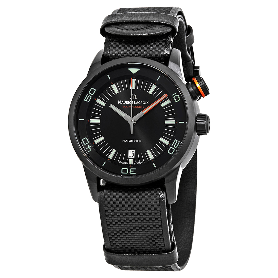 Stainless steel case with a black rubber/ leather strap. Bi-directional rotating bezel. Black dial with silver- orange tone hands and index hour markers. Dial Type: Analog. Luminescent hands and markers. Date display at the 6 o'clock position. Maurice Lacroix Calibre ML 115 automatic movement with a 38-hour power reserve. Scratch resistant sapphire crystal. Screw down crown. Round case shape, case size: 43 mm, case thickness: 15 mm. Buckle clasp. Water resistant at 600 meters / 2000 feet. Functions: date, hour, minute, second. Luxury watch style. Watch label: Swiss Made. Maurice Lacroix Pontos S Diver Automatic Mens Watch PT6248-PVB01-332-2.