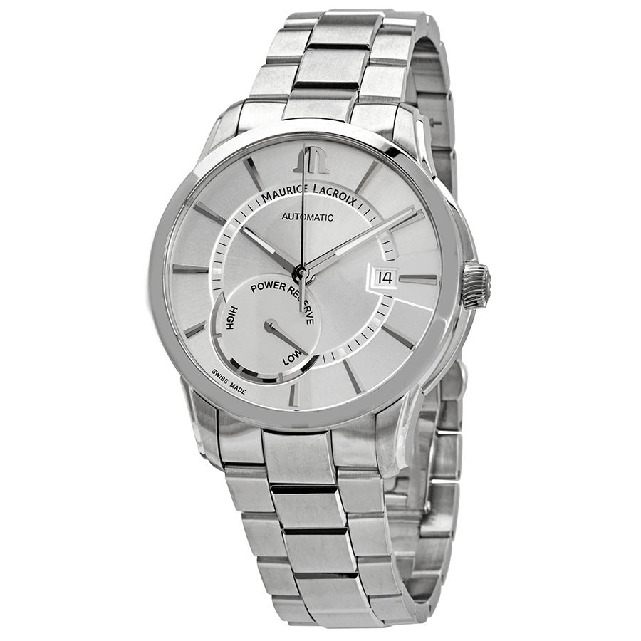 Stainless steel case with a stainless steel bracelet. Fixed bezel. Silver dial with silver-tone hands and index hour markers. Dial Type: Analog. Luminescent hands. Date display at the 3 o'clock position. One- power reserve. Automatic movement. Scratch resistant sapphire crystal. Screw down crown. Case size: 41 mm. Round case shape. Water resistant at 100 meters / 330 feet. Functions: date, hour, minute, second, power reserve indicatir. Luxury watch style. Watch label: Swiss Made. Maurice Lacroix Pontos Automatic Power Reserve Mens Watch PT6368-SS002-130.
