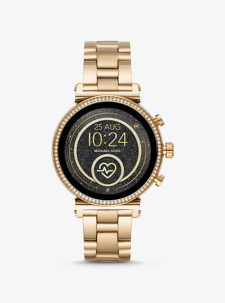 Gold-tone stainless steel case and bracelet. Fixed gold-tone bezel. Digital dial. Dial Type: Analog. Quartz movement. Scratch resistant mineral crystal. Pull / push crown. Solid case back. Round case shape. Case size: 41 mm. Deployment clasp. Water resistant at 30 meters / 100 feet. Functions: date, day, hour, minute, second, text/email alerts, app notifications, smart help from google, built-in fitness tracking, heart rate tracking, swimproof technology, payment technology, gps distance tracking, voice-activated google assistant. Additional Info: powered by wear os by google™, compatible with iphone® and android™ phones. Access Gen 4 Sofie Series. Casual watch style. Michael Kors Access Gen 4 Sofie Ladies Smart Watch MKT5062.