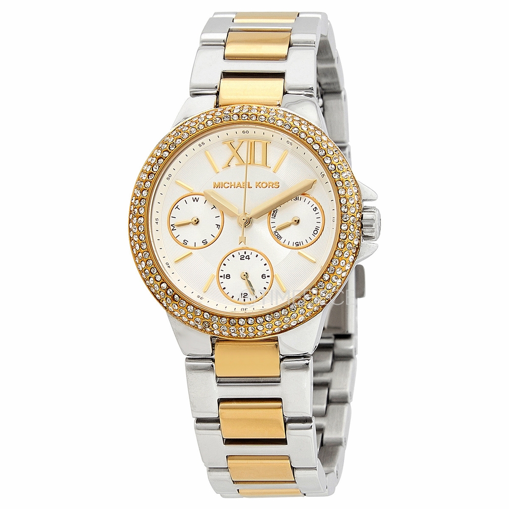 Stainless steel case with a two-tone (silver-tone and gold-tone) stainless steel bracelet. Fixed stainless steel set with crystals bezel. White dial with gold-tone hands and index hour markers. A Roman numeral appears at the 12 o'clock position. Arabic numeral minute markers (at 5 minute intervals). Minute markers around the outer rim. Dial Type: Analog. Three sub-dials displaying: 60 second, day of the week and date. Quartz movement. Scratch resistant mineral crystal. Pull / push crown. Solid case back. Round case shape. Case size: 33 mm. Case thickness: 9 mm. Band width: 18 mm. Deployment clasp with a push button release. Water resistant at 50 meters / 165 eet. Functions: chronograph, hour, minute, second. Camille Series. Dress watch style. Michael Kors Camille Chronograph Quartz Crystal White Dial Ladies Watch MK6982.