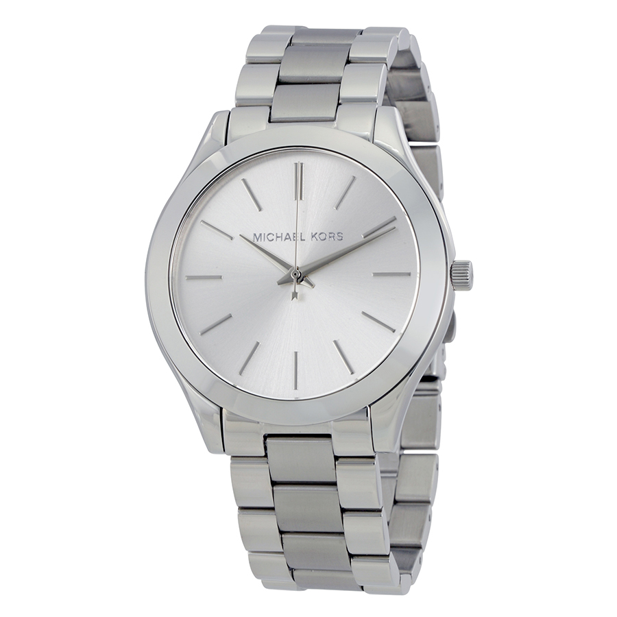 Stainless steel case and bracelet. Fixed stainless steel bezel. Silver dial with silver-tone hands and index hour markers. Dial Type: Analog. Quartz movement. Scratch resistant sapphire crystal. Pull / push crown. Solid case back. Case diameter: 42 mm. Case thickness: 8.5. Round case shape. Band width: 20 mm. Band length: 6.8 inches. Fold over clasp with safety release. Water resistant at 50 meters / 165 feet. Functions: hour, minute, second. Casual watch style. Michael Kors Runway Silver Dial Ladies Watch MK3178.