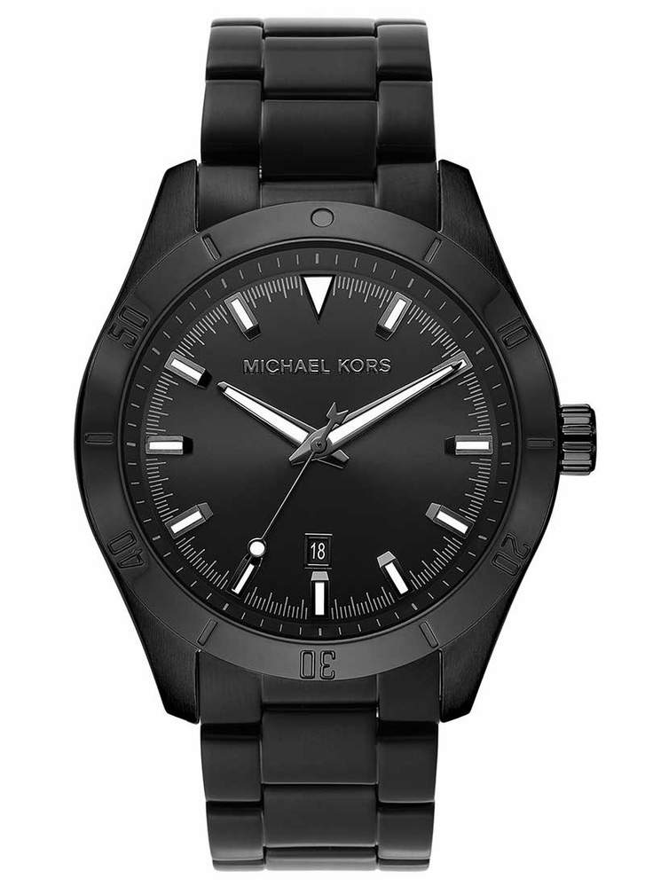 Black-plated stainless steel case and bracelet. Fixed black-plated bezel. Black dial with luminous black hands and index hour markers. Minute markers around the outer rim. Dial Type: Analog. Luminescent hands and markers. Date display above the 6 o'clock position. Quartz movement. Scratch resistant sapphire crystal. Pull / push crown. Solid case back. Round case shape. Case size: 44 mm. Case thickness: 10 mm. Band width: 22 mm. Fold over clasp with a push button release. Water resistant at 50 meters / 165 feet. Functions: date, hour, minute, second. Layton Series. Casual watch style. Michael Kors Layton Quartz Black Dial Mens Watch MK8817.