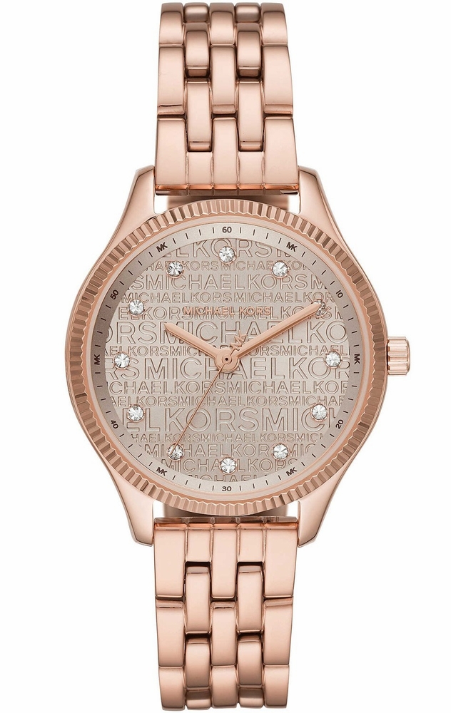 Rose gold-tone stainless steel case and bracelet. Fixed rose gold-tone bezel. Pink dial with rose gold-tone hands and crystal hour markers. Arabic numeral minute markers (at 10 minute intervals). Minute markers around the outer rim. Dial Type: Analog. Quartz movement. Scratch resistant mineral crystal. Pull / push crown. Solid case back. Round case shape. Case size: 36 mm. Case thickness: 7 mm. Band width: 16 mm. Fold over clasp with a push button release. Water resistant at 50 meters / 165 feet. Functions: hour, minute, second. Lexington Series. Casual watch style. Michael Kors Lexington Quartz Crystal Pink Dial Ladies Watch MK6799.