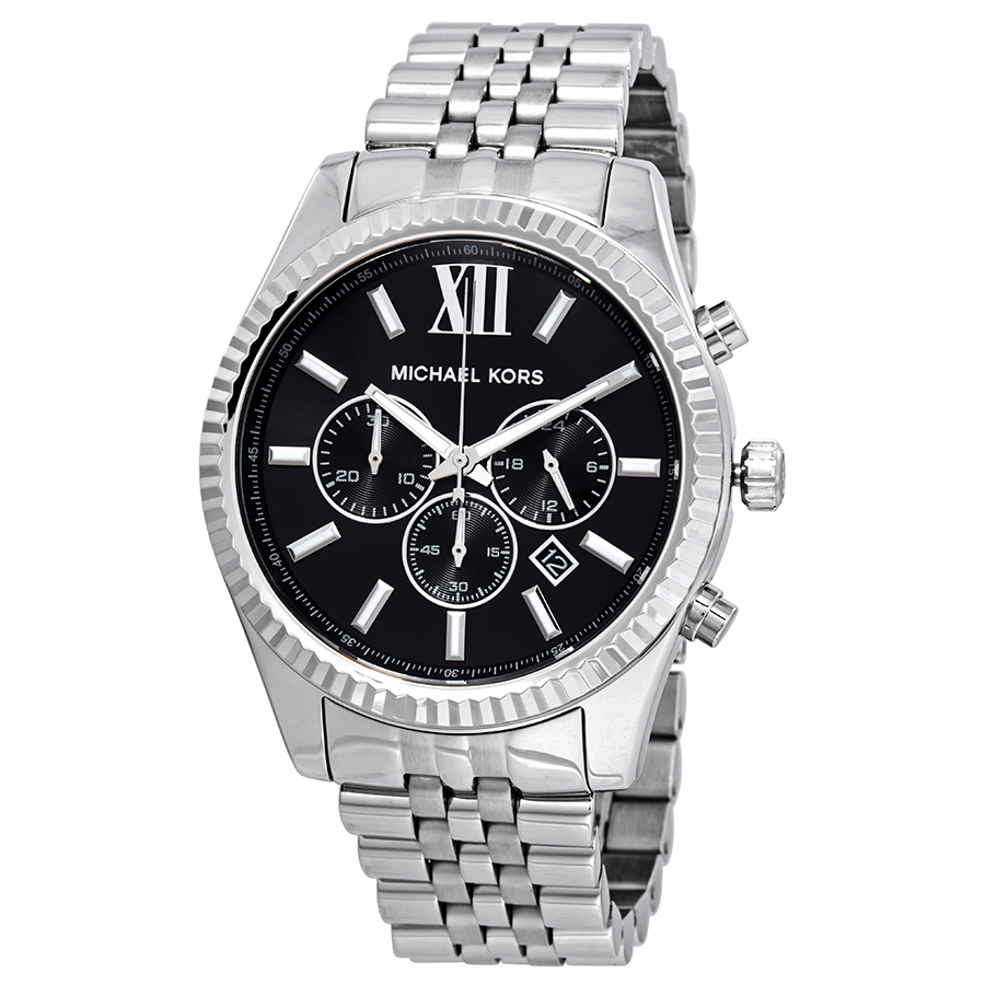 Stainless steel case with a stainless steel bracelet. Fixed stainless steel bezel. Black dial with luminous silver-tone hands and index hour markers. A Roman numeral appears at the 12 o'clock position. Minute markers around the outer rim. Dial Type: Analog. Luminescent hands and markers. Date display between the 4 and 5 o'clock positions. Chronograph - three sub-dials displaying: 60 second, 30 minute and 24 hour. Quartz movement. Scratch resistant mineral crystal. Pull / push crown. Solid case back. Round case shape. Case size: 44 mm. Case thickness: 13 mm. Band width: 22 mm. Fold over clasp. Water resistant at 100 meters / 330 feet. Functions: chronograph, date, GMT, second time zone, hour, minute, second. Sport watch style. Michael Kors Lexington Chronograph Black Dial Mens Watch MK8602.