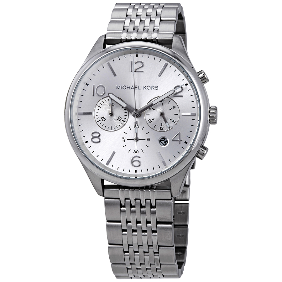 Stainless steel case with a stainless steel bracelet. Fixed stainless steel bezel. Silver dial with luminous silver-tone hands and alternating index and Arabic numeral hour markers. Minute markers around the outer rim. Dial Type: Analog. Luminescent hands and markers. Date display between the 4 and 5 o'clock positions. Chronograph - three sub-dials displaying: 60 second, 30 minute and 24 hour. Quartz movement. Scratch resistant mineral crystal. Pull / push crown. Solid case back. Round case shape. Case size: 42 mm. Case thickness: 8 mm. Band width: 20 mm. Fold over clasp with a push button release. Water resistant at 50 meters / 165 feet. Functions: chronograph, date, hour, minute, second. Casual watch style. Michael Kors Merrick Chronograph Quartz Silver Dial Mens Watch MK8637.
