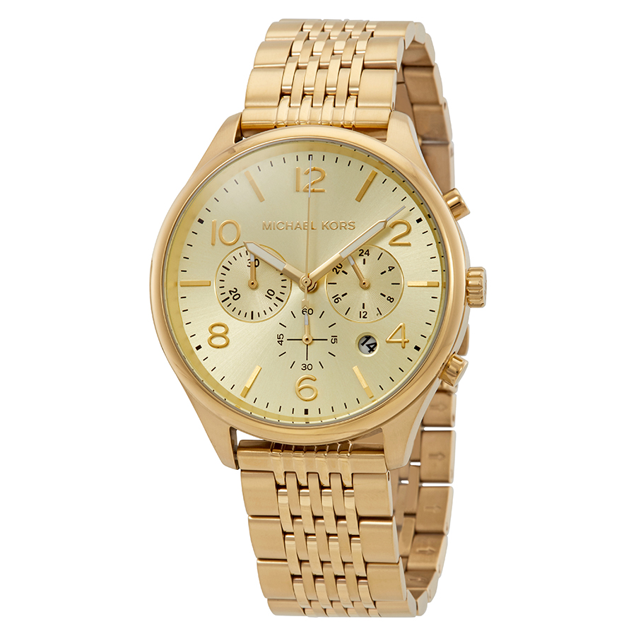 Yellow gold-tone stainless steel case and bracelet. Fixed yellow gold-tone bezel. Gold-tone dial with gold-tone hands and alternating Arabic numeral and index hour markers. Minute markers around the outer rim. Dial Type: Analog. Luminescent hands. Date display between the 4 and 5 o'clock positions. Chronograph - three sub-dials displaying: 60 second, 30 minute and 1/10th of a second. Quartz movement. Scratch resistant mineral crystal. Pull / push crown. Solid case back. Round case shape. Case size: 42 mm. Case thickness: 8 mm. Band width: 20 mm. Fold over clasp with a safety release. Water resistant at 50 meters / 165 feet. Functions: chronograph, date, hour, minute, second. Casual watch style. Michael Kors Merrick Chronograph Gold Dial Mens Watch MK8638.