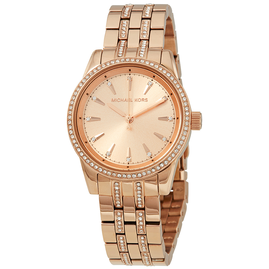 Rose gold-tone stainless steel case with a rose gold-tone stainless steel bracxelet set with crystals. Fixed rose gold-tonebezel set with crystals. Rose dial with rose gold-tone hands and crystal-tipped index hour markers. Minute markers around the outer rim. Dial Type: Analog. Quartz movement. Scratch resistant mineral crystal. Pull / push crown. Solid case back. Round case shape. Case size: 33 mm. Case thickness: 8 mm. Band width: 16 mm. Fold over clasp with a jewelry closure. Water resistant at 100 meters / 330 feet. Functions: hour, minute, second. Dress watch style. Watch label: Japan Movt. Michael Kors Mini Ritz Crystal Rose Gold Dial Ladies Watch MK3910.
