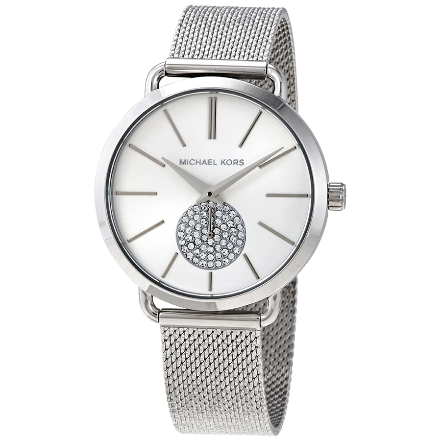 Stainless steel case with a stainless steel mesh bracelet. Fixed stainless steel bezel. Silver dial with silver-tone hands and index hour markers. Dial Type: Analog. Crystal pave small seconds sub-dial. Quartz movement. Scratch resistant mineral crystal. Screw down crown. Solid case back. Round case shape. Case size: 37 mm. Case thickness: 8 mm. Band width: 16 mm. Fold over slip through clasp. Water resistant at 50 meters / 165 feet. Functions: hour, minute, small second. Dress watch style. Watch label: Japan Movt. Michael Kors Portia Crystal Quartz Silver Dial Ladies Watch MK3843.