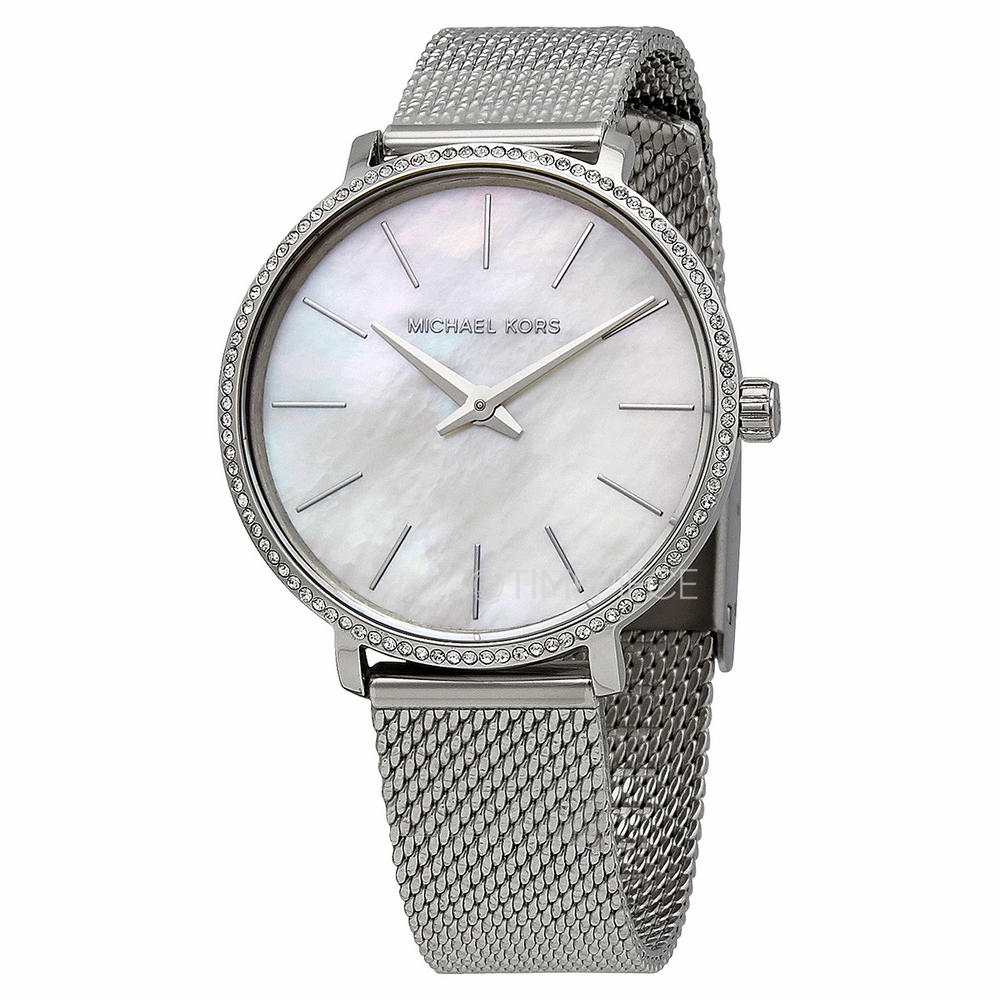 Stainless steel case with a stainless steel mesh bracelet. Fixed stainless steel bezel set with crystals. Mother of pearl dial with silver-tone hands and index hour markers. Dial Type: Analog. Quartz movement. Scratch resistant mineral crystal. Pull / push crown. Solid case back. Round case shape. Case size: 32 mm. Case thickness: 7 mm. Band width: 14 mm. Fold over slip through clasp. Water resistant at 50 meters / 165 feet. Functions: hour, minute. Pyper Series. Dress watch style. Michael Kors Pyper Quartz Crystal Mother of Pearl Dial Ladies Watch MK4618.