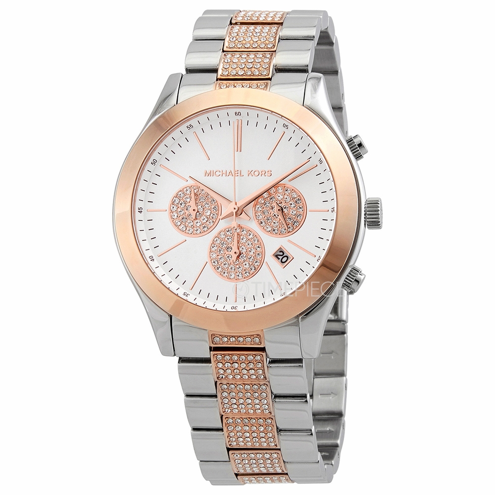 Stainless steel case with a two-tone (silver-tone and rose gold PVD) stainless steel bracelet. Fixed rose gold PVD bezel. Silver dial with rose gold-tone hands and index hour markers. Arabic numeral minute markers (at 5 minute intervals). Minute markers around the outer rim. Dial Type: Analog. Date display between the 4 and 5 o'clock positions. Chronograph - three sub-dials displaying: 60 second, 30 minute and 12 hour. Quartz movement. Scratch resistant mineral crystal. Pull / push crown. Solid case back. Round case shape. Case size: 44 mm. Case thickness: 12 mm. Band width: 22 mm. Fold over clasp with a push button release. Water resistant at 100 meters / 330 feet. Functions: chronograph, date, hour, minute, second. Slim Runway Series. Dress watch style. Michael Kors Slim Runway Chronograph Quartz Silver Dial Mens Watch MK8911.