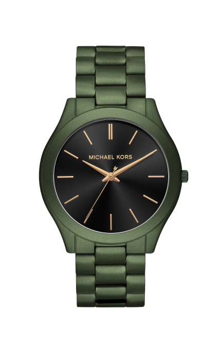 Green-plated stainless steel case and bracelet. Fixed green-plated bezel. Black dial with rose gold-tone hands and index hour markers. Dial Type: Analog. Quartz movement. Scratch resistant mineral crystal. Pull / push crown. Solid case back. Round case shape. Case size: 44 mm. Case thickness: 10 mm. Band width: 22 mm. Fold over clasp with a push button release. Water resistant at 50 meters / 165 feet. Functions: hour, minute, second. Slim Runway Series. Casual watch style. Michael Kors Slim Runway Quartz Black Dial Mens Watch MK8715.