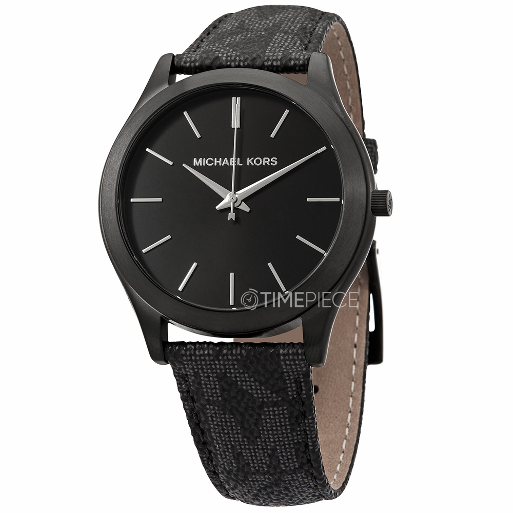 Black-plated stainless steel case with a black PVC (polyvinyl chloride) band. Fixed black-plated bezel. Black dial with silver-tone hands and index hour markers. Dial Type: Analog. Quartz movement. Scratch resistant mineral crystal. Pull / push crown. Solid case back. Round case shape. Case size: 44 mm. Case thickness: 10 mm. Band width: 22 mm. Tang clasp. Water resistant at 50 meters / 165 feet. Functions: hour, minute, second. Slim Runway Series. Casual watch style. Michael Kors Slim Runway Quartz Black Dial Mens Watch MK8908.