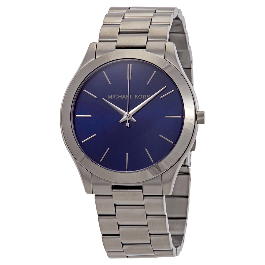 Gunmetal-plated stainless steel case with a gunmetal-plated stainless steel bracelet. Fixed gunmetal-plated stainless steel bezel. Blue dial with gunmetal hands and index hour markers. Dial Type: Analog. Quartz movement. Scratch resistant mineral crystal. Pull / push crown. Solid case back. Round case shape. Case size: 44 mm. Case thickness: 10 mm. Band width: 22 mm. Fold over clasp. Water resistant at 50 meters / 165 feet. Functions: hour, minute, second. Casual watch style. Michael Kors Slim Runway Blue Dial Gunmetal-plated Mens Watch MK8584.