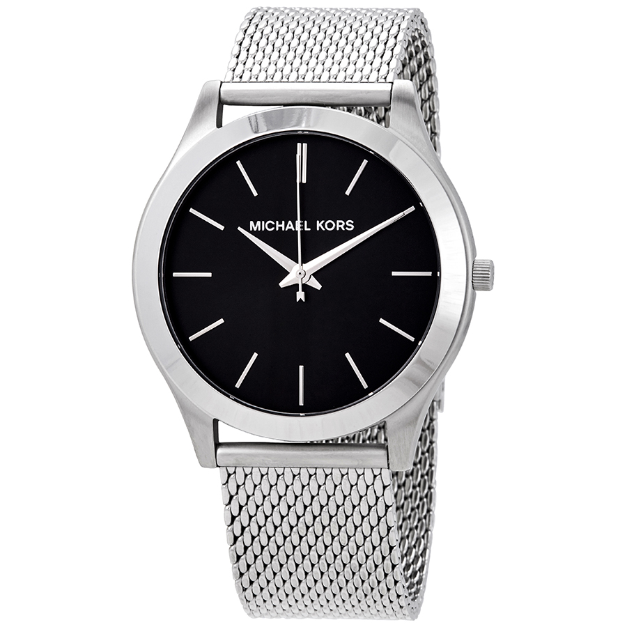 Stainless steel case with a stainless steel mesh bracelet. Fixed stainless steel bezel. Black dial with silver-tone hands and index hour markers. Dial Type: Analog. Quartz movement. Scratch resistant mineral crystal. Pull / push crown. Solid case back. Round case shape. Case size: 44 mm. Case thickness: 10 mm. Band width: 22 mm. Fold over clasp with a safety release. Water resistant at 50 meters / 165 feet. Functions: hour, minute, second. Casual watch style. Michael Kors Slim Runway Black Dial Stainless Steel Mens Watch MK8606.