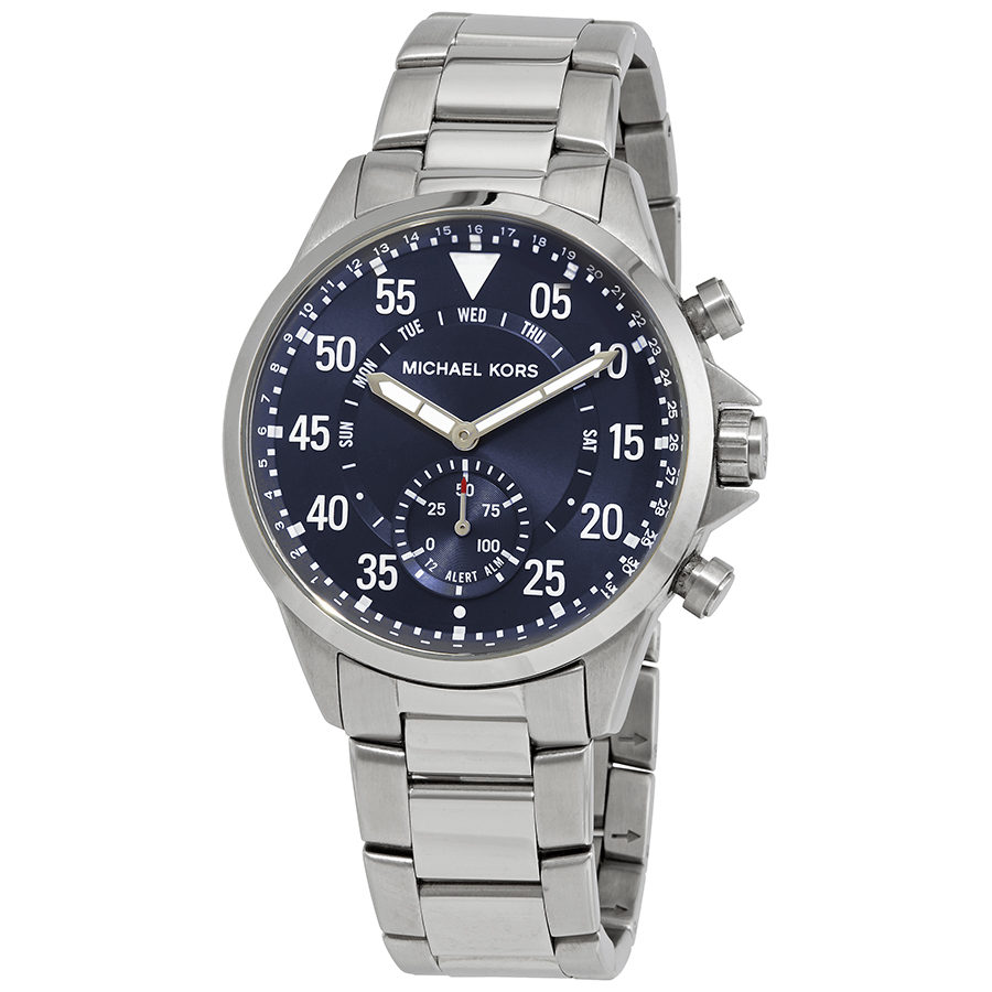 Silver-tone stainless steel case with a silver-tone stainless steel bracelet. Uni-directional rotating silver-tone stainless steel bezel. Blue dial with silver-tone hands and Arabic numeral hour markers. Minute markers around the outer rim. Dial Type: Analog-digital. One - small second subdial. Quartz movement. Scratch resistant mineral crystal. Pull / push crown. Solid case back. Round case shape, case size: 44 mm, case thickness: 13 mm. Band length: 9.5 inches. Fold over clasp. Water resistant at 30 meters / 100 feet. Functions: alarm, date, day, hour, minute, second, Bluetooth, receive notifications, sleep and activity tracking. Smart watch style. Watch label: Made in China. Michael Kors Hybrid Alarm Quartz Analog-Digital Blue Dial Smart Watch MKT4000.