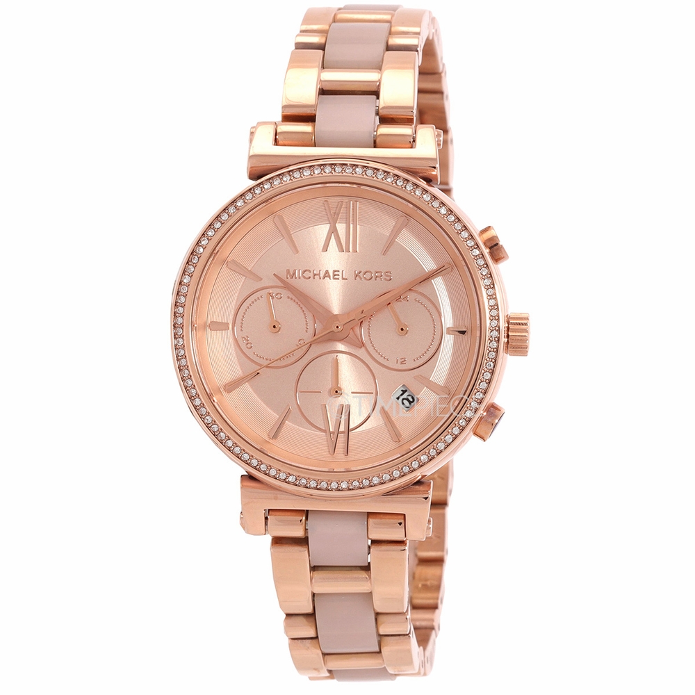 Rose gold-tone stainless steel case and bracelet. Fixed rose gold-tone bezel with crystal set. Rose gold dial with rose gold-tone hands and index-Roman numeral hour markers. Roman numeral marker appears at the 6 and 12 o'clock position. Dial Type: Analog. Date display between 4 and 5 o'clock position. Chronograph - three sub-dials displaying: 60 second, 30 minute and 12 hour. Quartz movement. Scratch resistant mineral crystal. Pull / push crown. Solid case back. Round case shape, case size: 39 mm. Band width: 18 mm. Fold over clasp with a safety release. Water resistant at 50 meters / 165 feet. Functions: chronograph, date, hour, minute, second. Sofie Series. Dress watch style. Michael Kors Sofie Chronograph Quartz Crystal Rose Gold Dial Ladies Watch MK6560I.