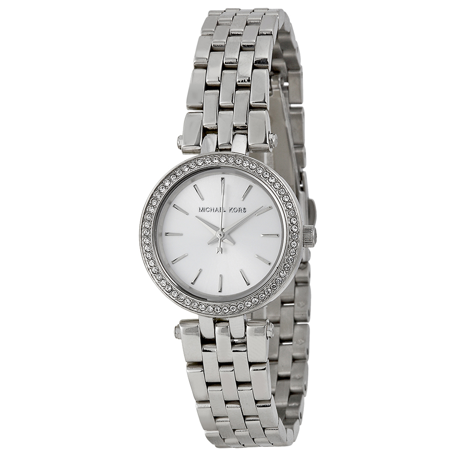 Stainless steel case with a stainless steel bracelet. Fixed stainless steel bezel set with crystals. Silver dial with silver-tone hands and index hour markers. Dial Type: Analog. Quartz movement. Scratch resistant mineral crystal. Pull / push crown. Solid case back. Case diameter: 26 mm. Case thickness: 7 mm. Round case shape. Band width: 16 mm. Deployment clasp. Water resistant at 50 meters / 165 feet. Functions: hour, minute, second. Casual watch style. Michael Kors Petite Darci Silver Dial Stainless Steel Ladies Watch MK3294.