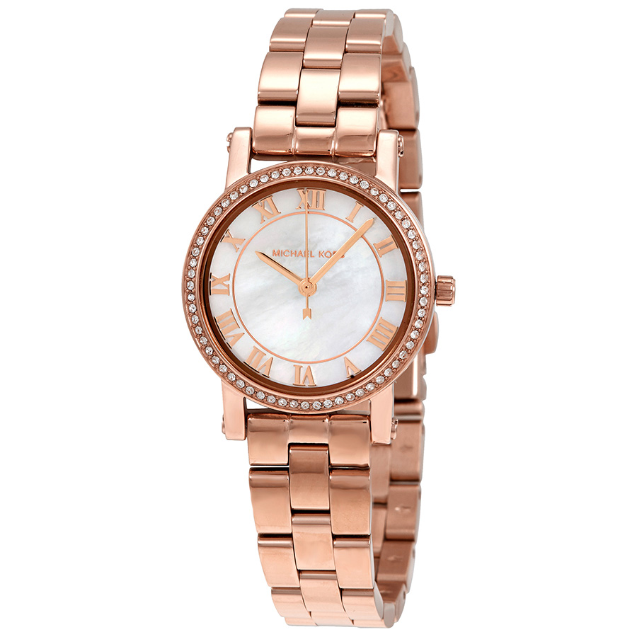 Rose gold-tone stainless steel case and bracelet. Fixed rose gold-tone bezel set with crystals. Mother of pearl dial with rose gold-tone hands and Roman numeral hour markers. Dial Type: Analog. Quartz movement. Scratch resistant mineral crystal. Pull / push crown. Solid case back. Round case shape, case size: 28 mm, case thickness: 8 mm. Band width: 14 mm. Deployment clasp with a push button release. Water resistant at 50 meters / 165 feet. Functions: hour, minute, second. Dress watch style. Michael Kors Norie Mother of Pearl Dial Laides Watch MK3558.