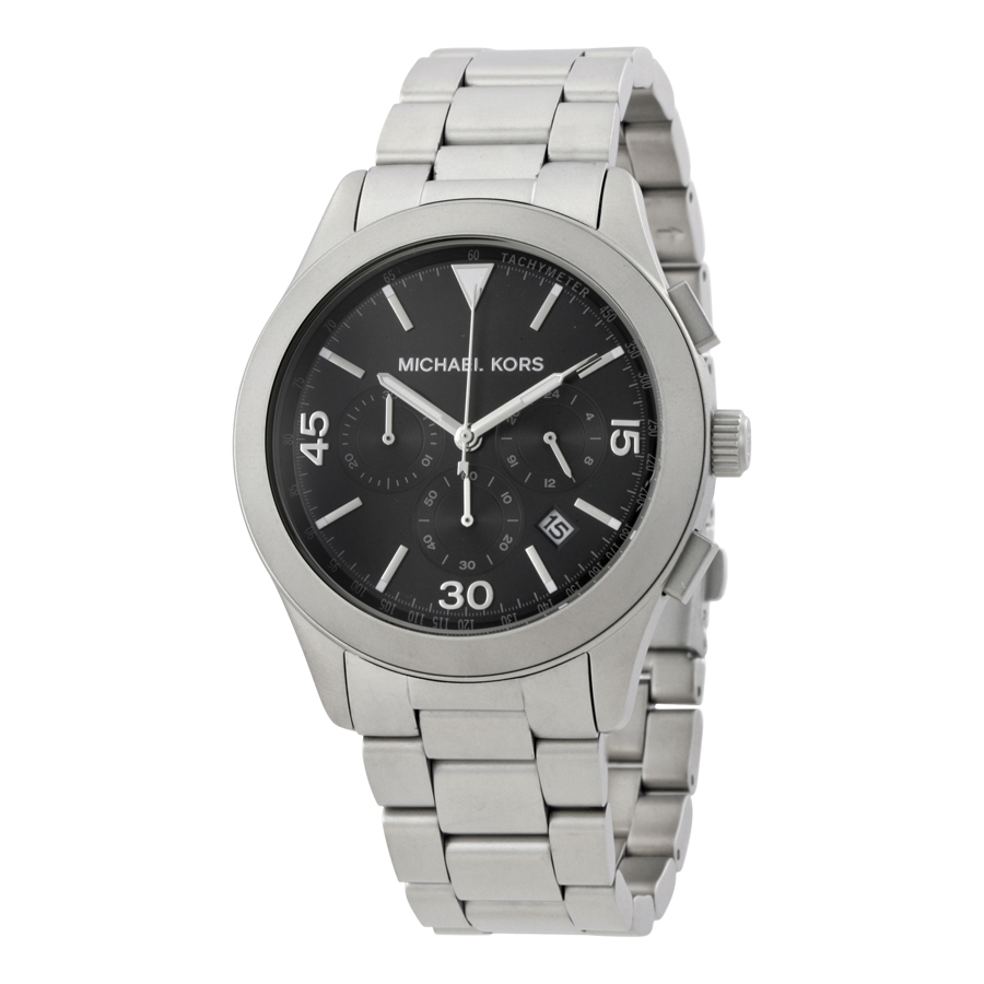 Stainless steel case with a stainless steel bracelet. Fixed stainless steel bezel. Black dial with luminous silver-tone hands and index hour markers. Arabic numerals mark the 15, 30 and 45 minute positions. Minute markers. Tachymeter markings around the outer rim. Dial Type: Analog. Luminescent hands. Date display between the 4 and 5 o'clock positions. Chronograph - three sub-dials displaying: 60 second, 30 minute and 24 hour. Quartz movement. Scratch resistant mineral crystal. Pull / push crown. Solid case back. Case size: 43 mm. Case thickness: 12 mm. Round case shape. Band width: 22 mm. Deployment clasp. Water resistant at 50 meters / 165 feet. Functions: chronograph, date, hour, minute, second. Sport watch style. Michael Kors Gareth Chronograph Black Dial Mens Watch MK8469.