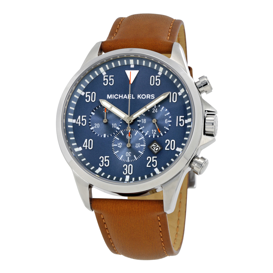 Stainless steel case with a brown leather strap. Fixed stainless steel bezel. Blue dial with lumerous silver-tone hands and Arabic numeral minute markers (at 5 minute intervals). Minute markers around the outer rim. Dial Type: Analog. Luminescent hands. Date display between the 4 and 5 o'clock positions. Chronograph - three sub-dials displaying: 60 seconds, 30 minutes, and 24 hours. Quartz movement. Scratch resistant mineral crystal. Pull / push crown. Solid case back. Case size: 45 mm. Case thickness: 13 mm. Round case shape. Band width: 24 mm. Tang clasp. Water resistant at 100 meters / 330 feet. Functions: chronograph, date, hour, minute, second. Casual watch style. Michael Kors Gage Chronograph Mens Watch MK8490.