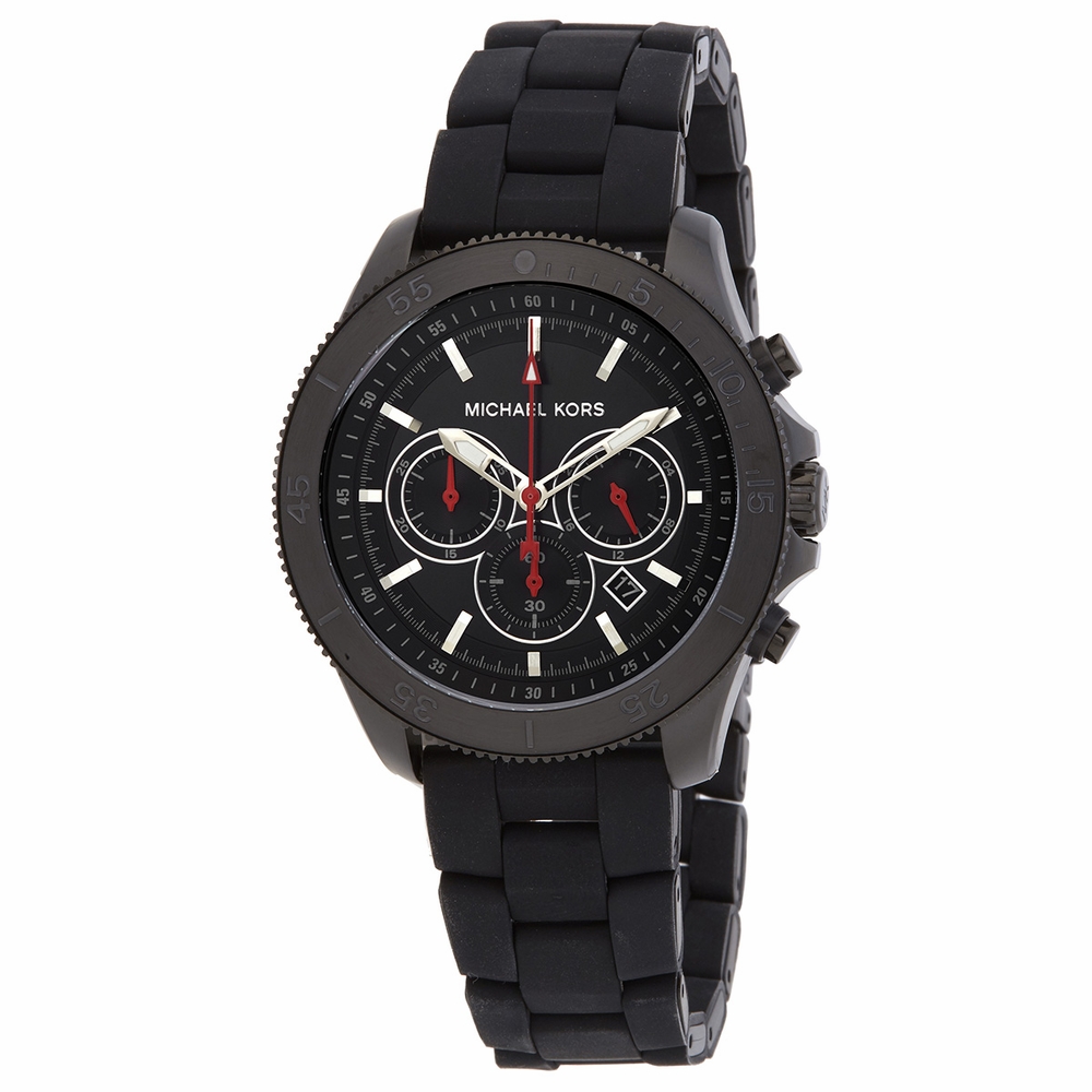 Black-tone stainless steel case and bracelet. Black-tone stainless steel bezel. Black dial with silver-tone hands and index hour markers. Minute markers around the outer rim. Dial Type: Analog. Luminescent hands and markers. Date display between the 4 and 5 o'clock positions. Chronograph - three sub-dials displaying: 60 second, 30 minute and 24 hour. Quartz movement. Pull / push crown. Solid case back. Round case shape. Case size: 44.5 mm. Case thickness: 11 mm. Band width: 22 mm. Fold over clasp. Water resistant at 50 meters / 165 feet. Functions: chronograph, date, hour, minute, second. Cortlandt Series. Sport watch style. Michael Kors Cortlandt Chronograph Quartz Black Dial Mens Watch MK8667.