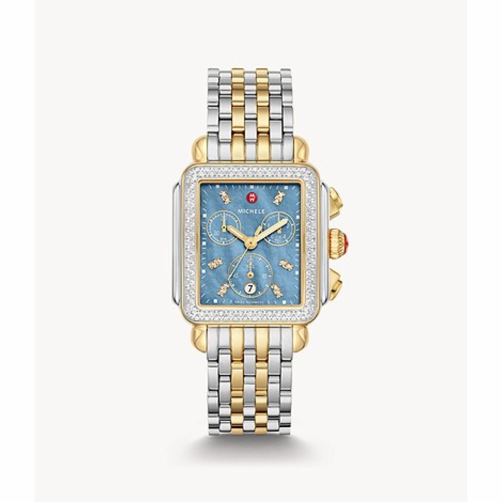 Stainless steel case with a two-tone (silver-tone and yellow gold-plated ) stainless steel bracelet. Fixed yellow gold-plated bezel set with diamonds. Blue mother of pearl dial with luminous yellow gold-tone hands and diamond index hour markers. Minute markers around the outer rim. Dial Type: Analog. Luminescent hands. Date display above the 6 o'clock position. Quartz movement. Scratch resistant sapphire crystal. Solid case back. Rectangle case shape. Case dimensions: 33 mm x 35 mm. Band width: 18 nn. Fold over clasp. Functions: chronograph, date, hour, minute, second. Deco Series. Fashion watch style. Watch label: Swiss Made. Michele Deco Chronograph Quartz Diamond Blue Dial Ladies Watch MWW06A000789.