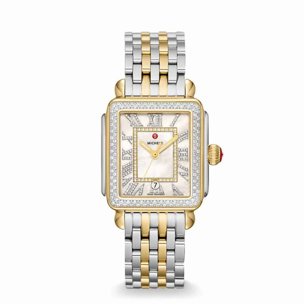 Silver-tone stainless steel case with a two-tone (silver-tone and yellow gold-tone) stainless steel bracelet. Fixed yellow gold-tone stainless steel bezel. Silver-tone dial with yellow gold-tone hands and Roman numeral hour markers. Dial Type: Analog. Date display at the 6 o'clock position. Quartz movement. Rectangle case shape, case size: 33 mm. Fold over clasp with a safety release. Functions: date, hour, minute, second. Deco Madison Series. Casual watch style. Watch label: Swiss Made. Michele Deco Madison Quartz Silver Dial Ladies Watch MWW06T000236.