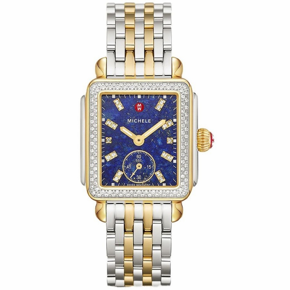 Silver-tone stainless steel case with a two-tone (silver-tone and yellow gold-tone) stainless steel bracelet. Fixed yellow gold-tone bezel with diamond set stainless steel. Blue dial with yellow gold-tone hands and diamond hour markers. Minute markers around the outer rim. Dial Type: Analog. Luminescent hands and markers. Quartz movement. Scratch resistant sapphire crystal. Rectangle case shape, case size: 29 mm. Band width: 16 mm. Fold over clasp with a safety release. Functions: hour, minute, second. Deco Mid Series. Casual watch style. Watch label: Swiss Made. Michele Deco Mid Quartz Diamond Blue Dial Ladies Watch MWW06V000125.