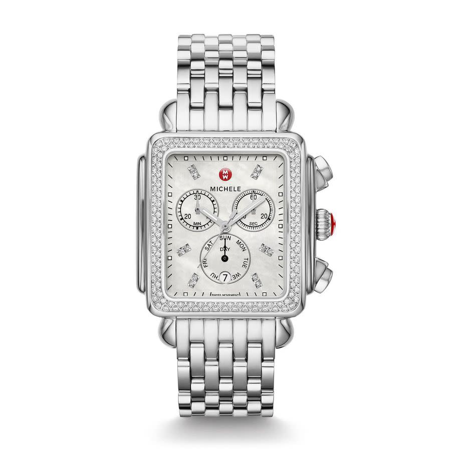 Stainless steel case with a stainless steel bracelet. Fixed stainless steel bezel set with diamonds. Mother of pearl dial with luminous silver-tone hands and diamond-set index hour markers. Minute markers around the outer rim. Dial Type: Analog. Luminescent hands and markers. Chronograph - two sub-dials displaying: 60 second and 30 minute. Day of the week sub-dial. Quartz movement. Scratch resistant mineral crystal. Pull / push crown. Solid case back. Rectangle case shape. Case dimensions: 38 mm x 36.5 mm. Band width: 20 mm. Fold over clasp. Water resistant at 50 meters / 165 feet. Functions: chronograph, hour, minute, second, day. Deco Xl Series. Casual watch style. Michele Michele Deco Xl Diamond Mother of Pearl Dial Ladies Watch Mww06z000035.