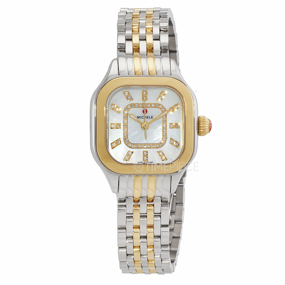 Silver-tone stainless steel case with a two-tone (silver-tone and yellow gold-tone) stainless steel bracelet. Fixed yellow gold-tone stainless steel bezel. Mother of pearl dial with yellow gold-tone hands and diamond hour markers. Dial Type: Analog. Quartz movement. Square case shape, case size: 29 mm. Fold over clasp with a safety release. Water resistant at 50 meters / 165 feet. Functions: hour, minute, second. Meggie Series. Casual watch style. Watch label: Swiss Made. Michele Meggie Quartz Diamond Ladies Watch MWW33B000009.