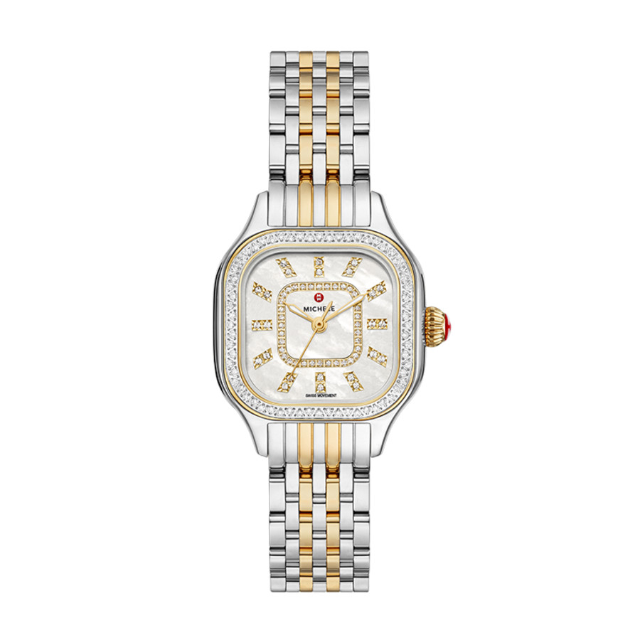 Stainless steel case with a two-tone (silver-tone and yellow gold PVD) stainless steel bracelet. Fixed yellow gold PVD bezel set with diamonds. Mother of pearl (diamond-set) dial with luminous yellow gold-tone hands and diamond index hour markers. Dial Type: Analog. Quartz movement. Scratch resistant sapphire crystal. Pull / push crown. Solid case back. Square case shape. Case size: 27 mm. Band width: 14 mm. Deployment clasp. Water resistant at 30 meters / 100 feet. Functions: hour, minute, second. Meggie Series. Casual watch style. Michele Meggie Quartz Diamond Ladies Watch MWW33B000002