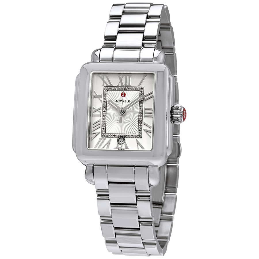Stainless steel case with a stainless steel bracelet. Fixed stainless steel bezel. Silver sunray dial with luminous silver-tone hands and Roman numeral hour markers. Dial Type: Analog. Luminescent hands. Date display at the 6 o'clock position. Quartz movement. Scratch resistant sapphire crystal. Pull / push crown. Solid case back. Case size: 33 mm x 35 mm, case thickness: 11 mm. Rectangle case shape. Band width: 18 mm. Deployment clasp. Water resistant at 50 meters / 165 feet. Functions: date, hour, minute, second. Luxury watch style. Watch label: Swiss Made. Michele Deco Madison Silver Sunray Diamond Ladies Watch MWW06T000141.