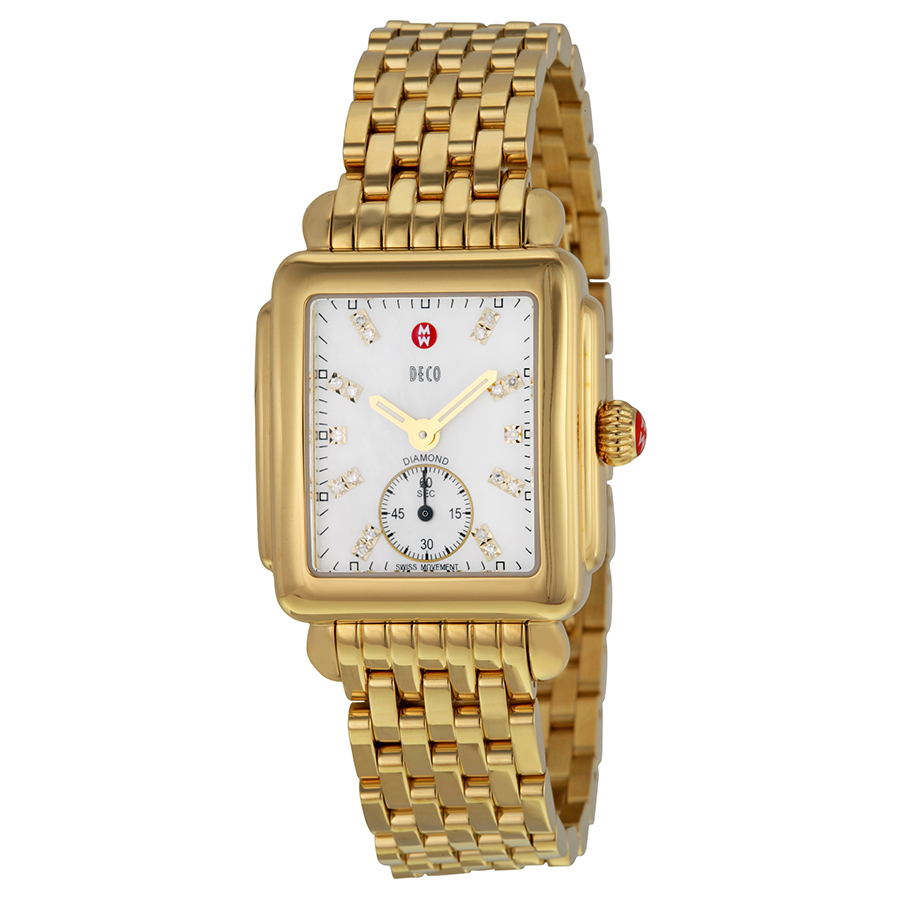 Gold-plated stainless steel case and bracelet. Fixed gold-plated bezel. Mother of pearl dial with luminous hands and diamond-set index hour markers. Minute markers around the outer rim. Luminescent hands and markers. Seconds sub-dial at the 6 o'clock position. Swiss quartz movement. Scratch resistant sapphire crystal. Solid case back. Case dimensions: 29 mm x 31 mm. Case thickness: 10 mm. Deployment clasp. Water resistant at 50 meters/ 165 feet. Functions: hours, minutes, small seconds. Michele Deco 16 Ladies Mother of Pearl Dial with Diamond Watch MWW06V000004.