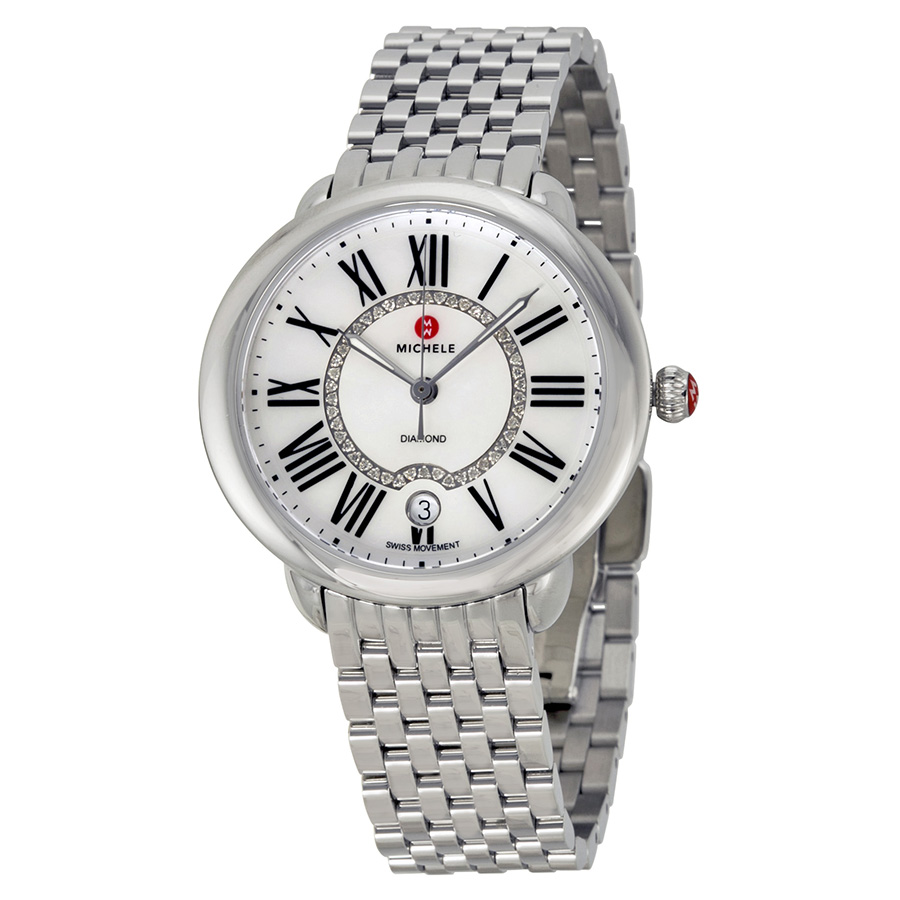 Stainless steel case with a stainless steel bracelet. Fixed stainless steel bezel. Mother of pearl set with diamonds dial with luminous silver-tone hands and Roman numeral hour markers. Minute markers around the outer rim. Dial Type: Analog. Luminescent hands. Date display at the 6 o'clock position. Quartz movement. Scratch resistant sapphire crystal. Pull / push crown. Solid case back. Case size: 36 mm. Case thickness: 8.5 mm. Round case shape. Band width: 16 mm. Fold over with double push button release clasp. Water resistant at 50 meters / 165 feet. Functions: date, hour, minute, second. Additional Info: suitable for swimming and showering. Dress watch style. Watch label: Swiss Made. Michele Serein Mother of Pearl Dial Ladies Watch MWW21B000009.